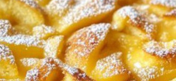 Peel and dice the apples. Grease a baking sheet and place the apples on it (if desired, sprinkle with sugar or cinnamon). Pour the mixture over the apples and level the surface. Click to go to the next page.
