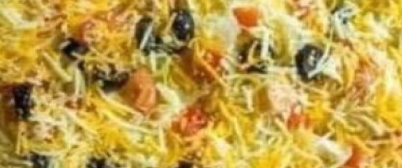 Sprinkle the chopped lettuce, tomatoes, and optional olives over the sour cream, then add a generous layer of cheddar cheese on top.