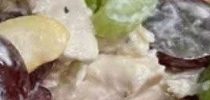 In a large bowl, combine cooked chicken, halved grapes, celery, and red onion.