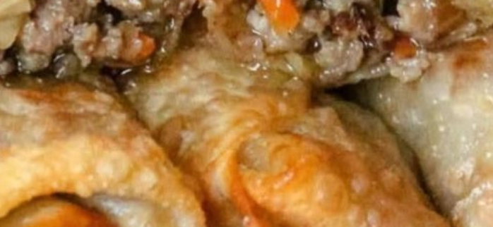 Savory filling: Think shredded cabbage, carrots, garlic, ground pork or chicken, maybe a splash of soy sauce.