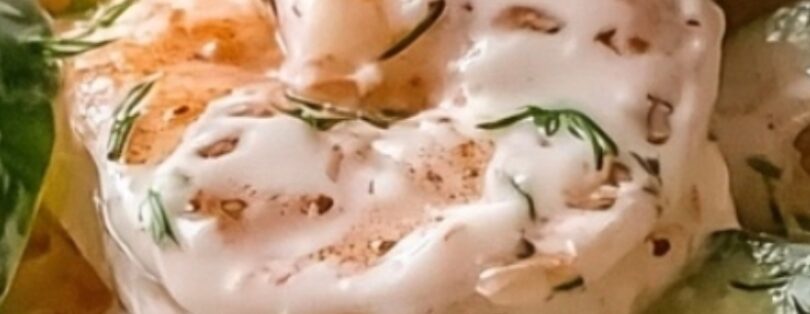 • In a small bowl, whisk together Greek yogurt, mayonnaise, lemon juice, dill, garlic, salt, and pepper until smooth.