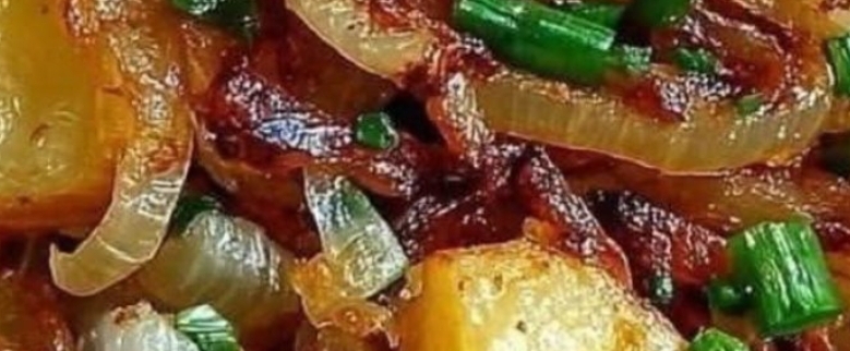 · Once the potatoes are crispy, reduce the heat to medium. Add the cooked onions back into the skillet.