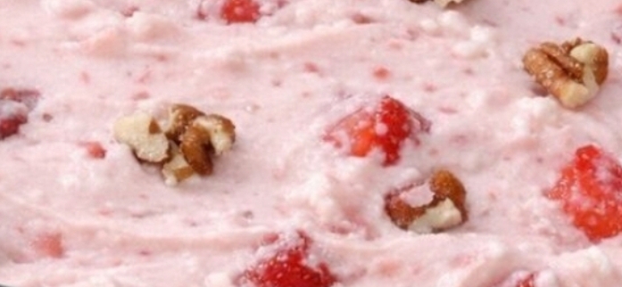 Step 3: The Fruit and Nut Toss: Gently fold in the finely diced strawberries and the 1/2 cup of chopped pecans. The strawberries will naturally release a tiny bit of juice, tinting the entire mixture a beautiful, pale blush pink.