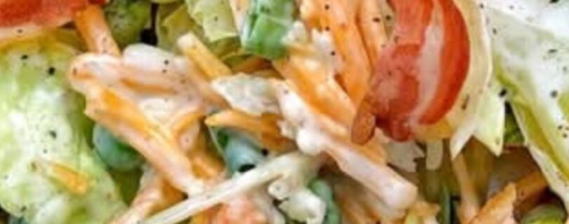 This classic American layered saladfeatures distinct ingredients arranged in visible strata within a clear serving dish. It is traditionally served cold at gatherings and communal meals.