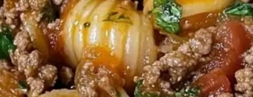 - While the water heats, heat olive oil in a large skillet or Dutch oven over medium-high heat. Add the ground beef and diced onion. Cook, breaking the meat apart with a spoon, until the beef is browned and the onion is softened. Drain any excess fat.